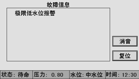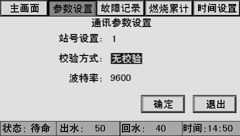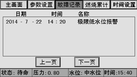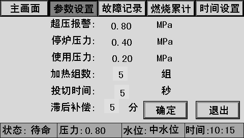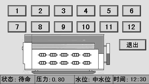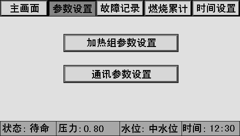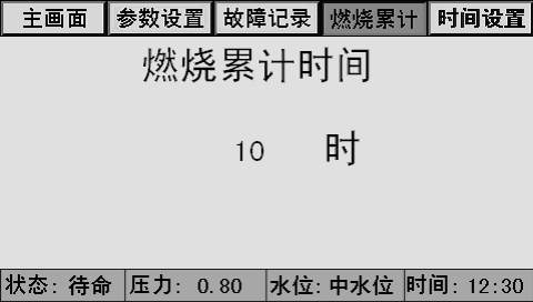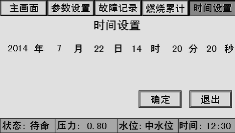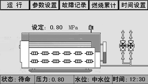 主畫(huà)面上同時(shí)顯示控制器狀態(tài)、系統(tǒng)壓力、水位、時(shí)間、燃燒器狀態(tài)、泵狀態(tài)等。