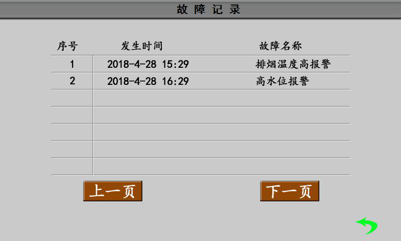 控制器開機后即不間斷地對溫度傳感器、壓力傳感器、水位傳感器以及自身電路進行檢測,檢測到故障時,立即發(fā)出聲光報警并聯(lián)鎖關(guān)閉燃燒器或加熱組和水泵等設(shè)備。并在屏幕下方的工況欄中,顯示出具體的報警信息。