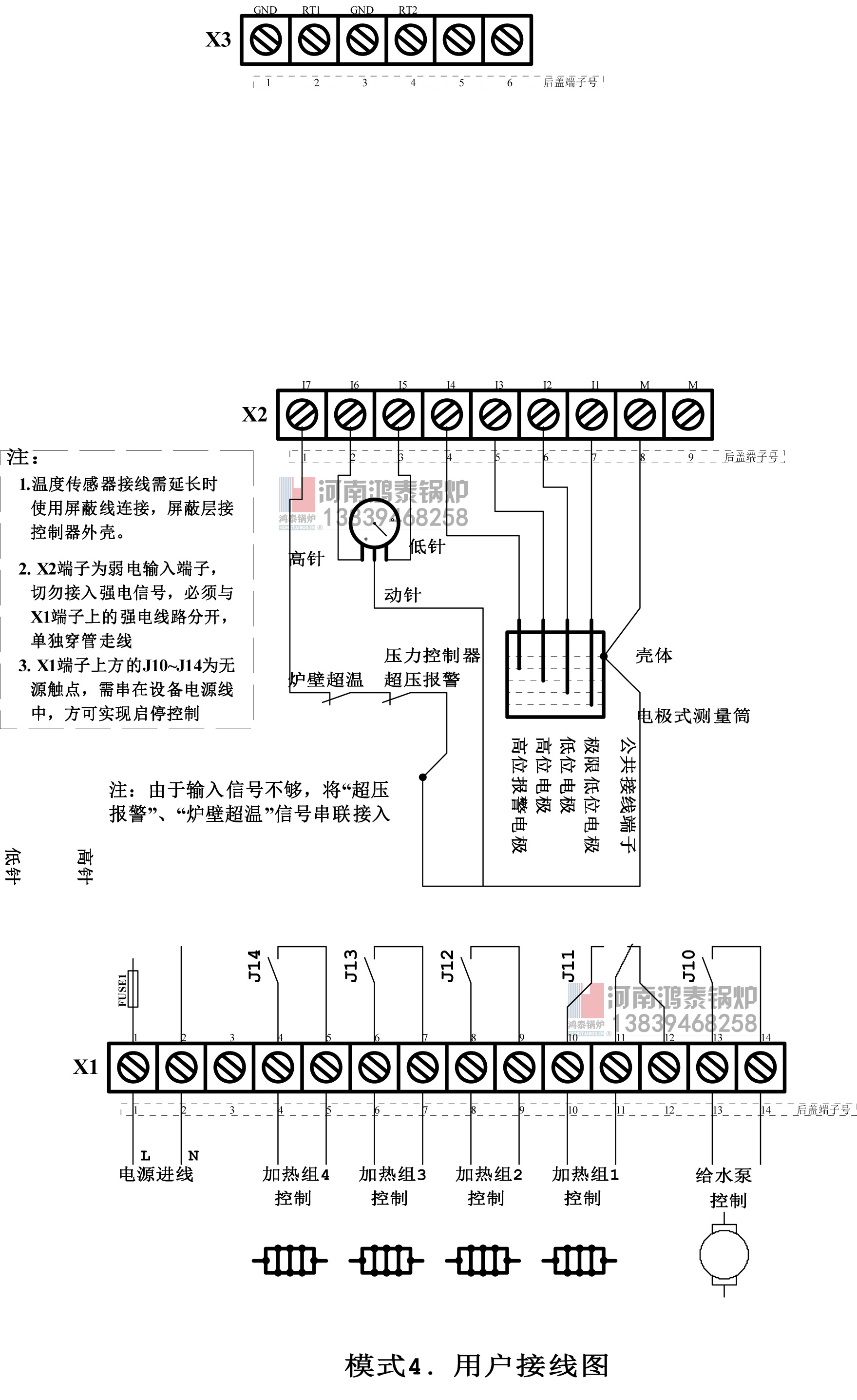②按“用戶接線圖”將所需接入的各強、弱電線分別與控制器相應端子連接。