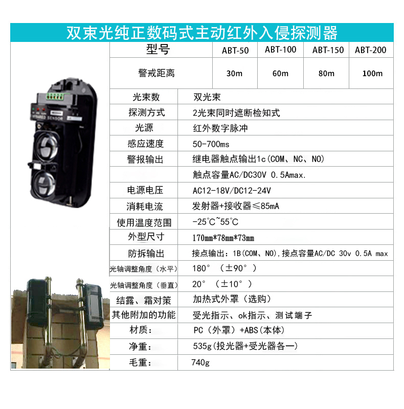 ABE三光束數(shù)碼紅外對射室外探測,廠家直銷 1、防雷擊電路設計 2、專業(yè)抗干擾光學外罩 3、日本同禾大功率 紅外發(fā)射芯片 4、SMT工藝