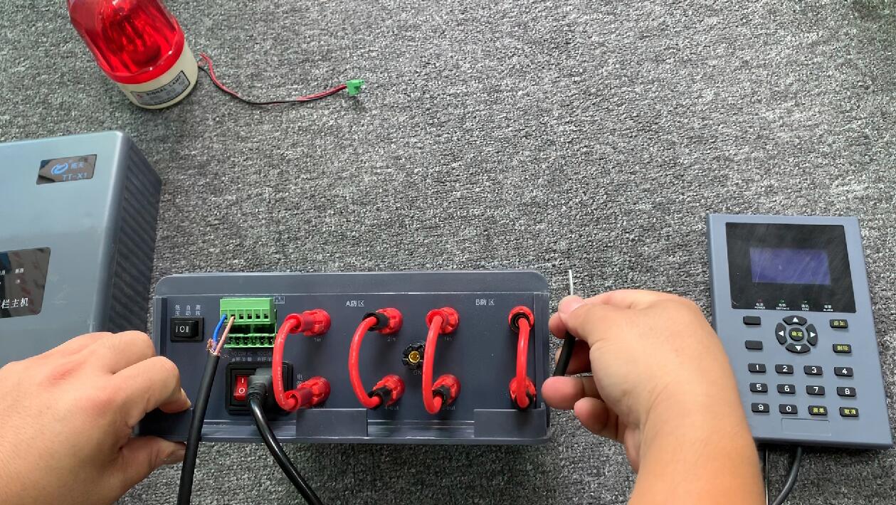 現(xiàn)在拓天電子圍欄廠家就來簡單的說下報警故障的排查方法。就是我們把脈沖主機和前端圍欄連接的線都斷開,另外用幾跟短線把脈沖主機上1IN和3OUT的接口連接起來,2IN和4OUT的接口連接起來,如果是雙防區(qū)主機,那兩個防區(qū)都要分別連接起來。這樣就像連接了前端圍欄一樣,主機形成了兩組回路。(如下圖)