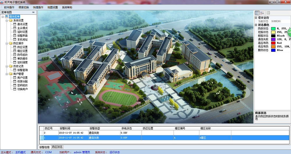 電子地圖:可對BMP格式的圖片進(jìn)行防區(qū)定義,可以區(qū)分不同報警的顏色設(shè)置,報警時定義的防區(qū)閃爍。直觀,方便!