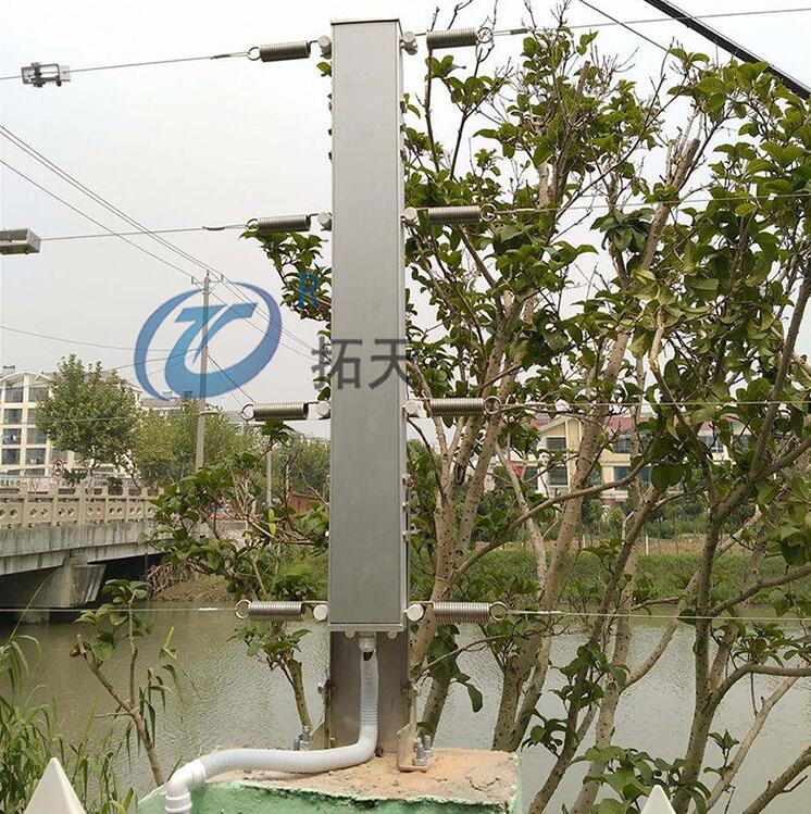 張力式電子線攬由普通的金屬絲線及張力探測器構(gòu)成。這個(gè)系統(tǒng)通過張力探測器連接多種類型的有規(guī)則的絲線,每個(gè)張力探測器把任何企圖攀爬,切割線攬線的人力、機(jī)械力(發(fā)生的力變)轉(zhuǎn)換成電子信號并傳送到控制中心,以達(dá)到報(bào)警的目的。